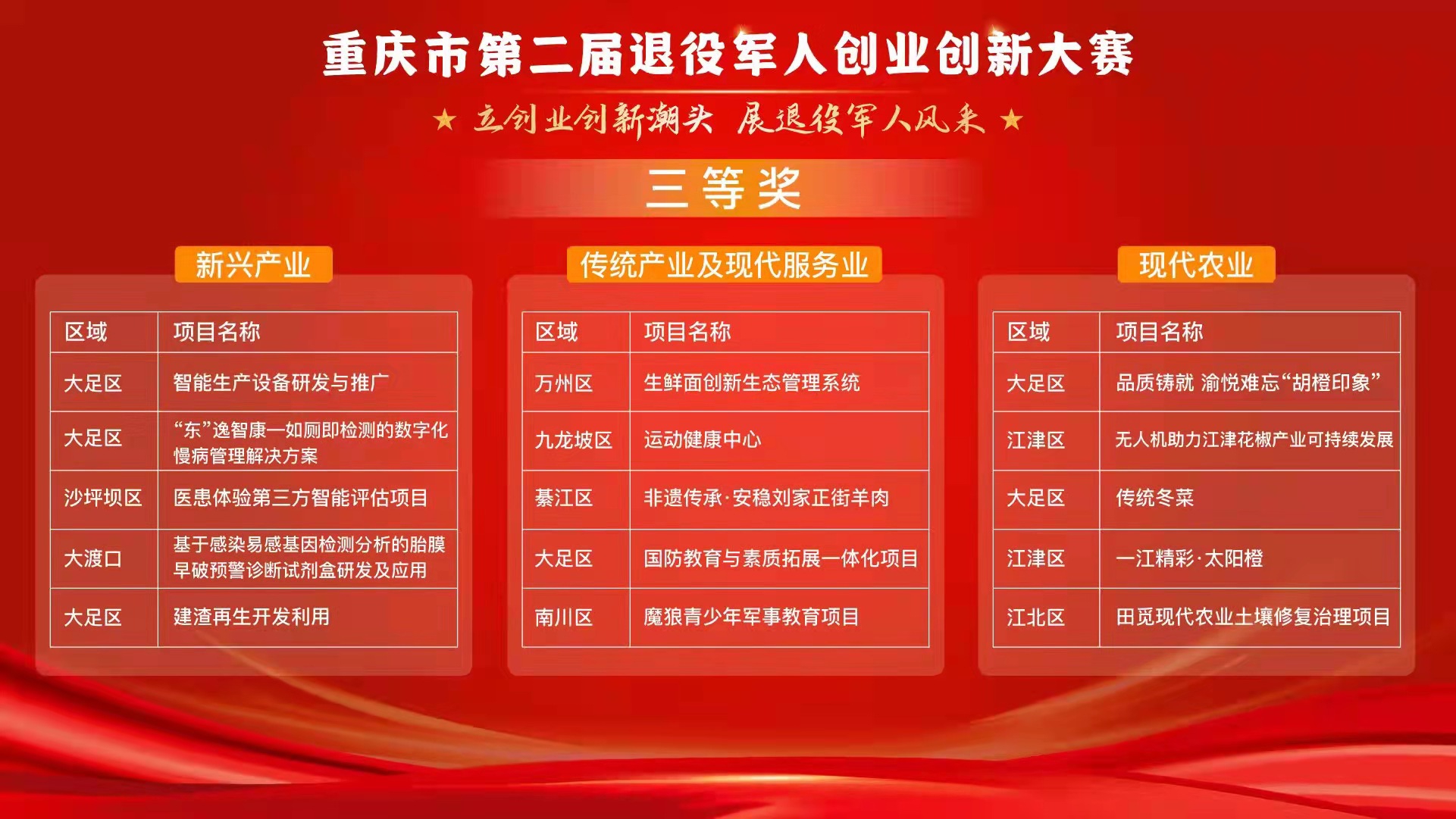 近日,由重庆市退役军人事务局、重庆市人力资源和社会保障局、重庆警备区政治工作局、共青团重庆市委员会联合主办,各区县退役军人事务局协办的“2021年重庆市退役军人创业创新大赛”落下帷幕;