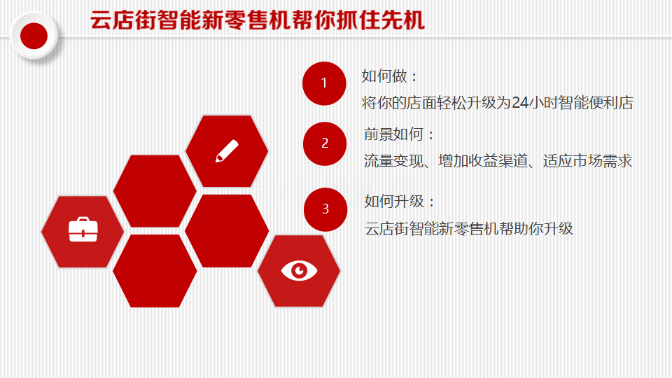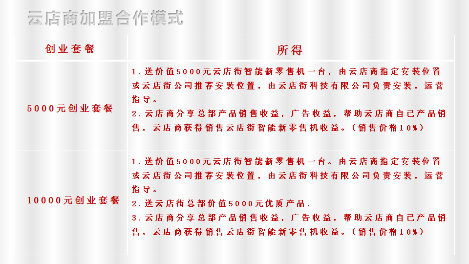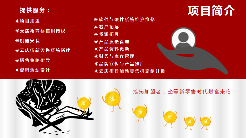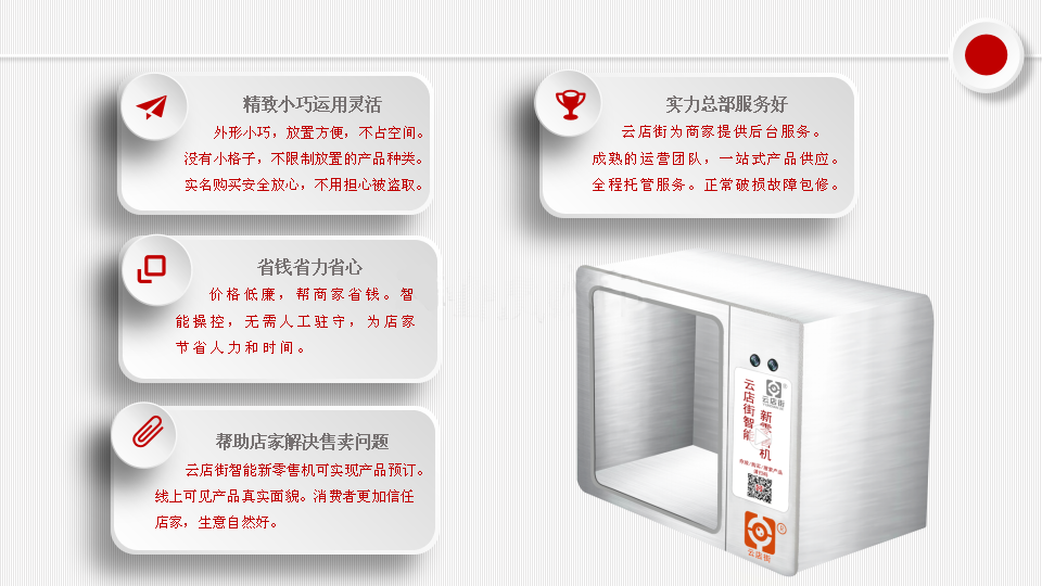 你只需要花5000元,购买云店街智能新零售机,“小云”就365个日日夜夜24小时全天候为你矜矜业业打点你的店铺。“小云”是你商业版的雷锋哟~不需要你付一分钱工资,给“电”吃即可!上述你所遇到的众多开店难题便迎刃而解!!