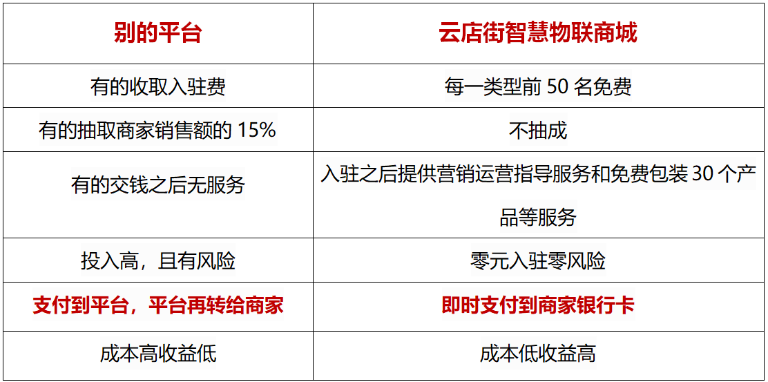 对于商家来说,加入云店街物流,拥有云店街新零售机寄存快递,成为物流自提站,支持送货上门,可以获得更多的客户,并且还能免费入驻云店街商城。那么云店街商城又和其他商城平台有什么区别呢?用一个表格对比说明。