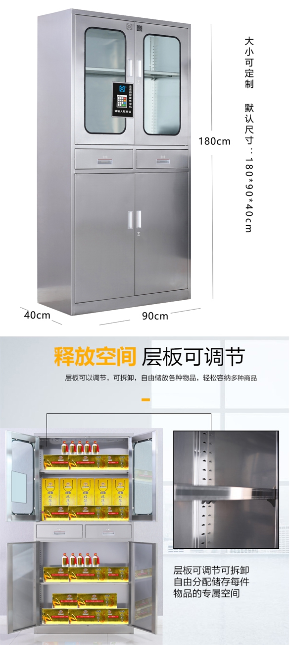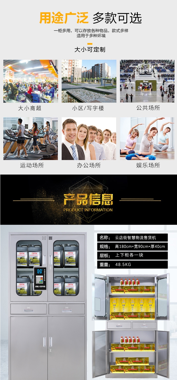 该智能售货机是云店街系列的小云3号系列,默认尺寸为:180cm*90cm*40cm,使用5-6v直流电,容量大能耗低。小云3号使用智能锁,只能随机独立密码开锁,保障了产品安全。柜中隔板高度可调节,根据产品高度大小调整,可放多类产品。本产品还使用的是不锈钢材质,耐脏易清洁,是商家创业者的不二选择!