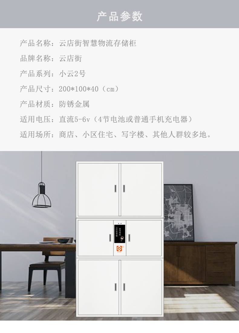 云店街智慧物流存储柜采用防锈金属制成,拥有广告投放屏,默认尺寸为200*100*40cm,三个柜体可拆分组装。该存储柜采用NB-IOT物联网技术,在无常规网络覆盖区域仍然可以实现远程控制效果。所以只需使用直流5-6v电即可,省电好用。偏远山区也可使用,24小时不断电!!
