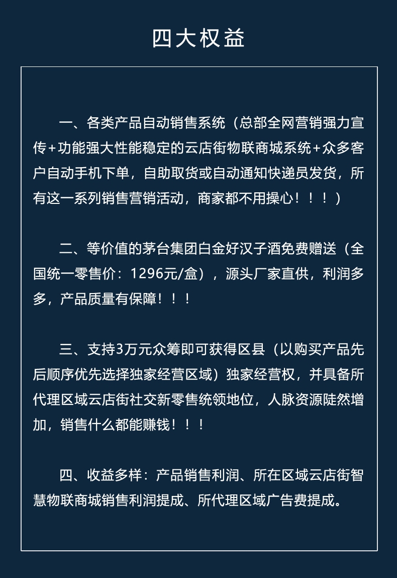 云店街智能柜火爆众筹,你参与,我回馈:云店街智能柜区(县)或省(市)区域独家代理!!!+10台或50台云店智能柜+等价值茅台集团白金好汉子酒23盒(价值3万元)或115盒(价值15万元)。通过云店街智能快递柜自动卖出茅台集团白金好汉子酒后,相当于免费获取50台(或10台)智能快递存储柜!云店街智能!柜不贵!