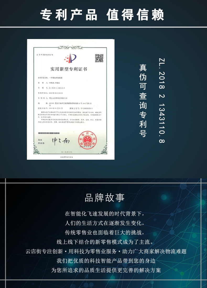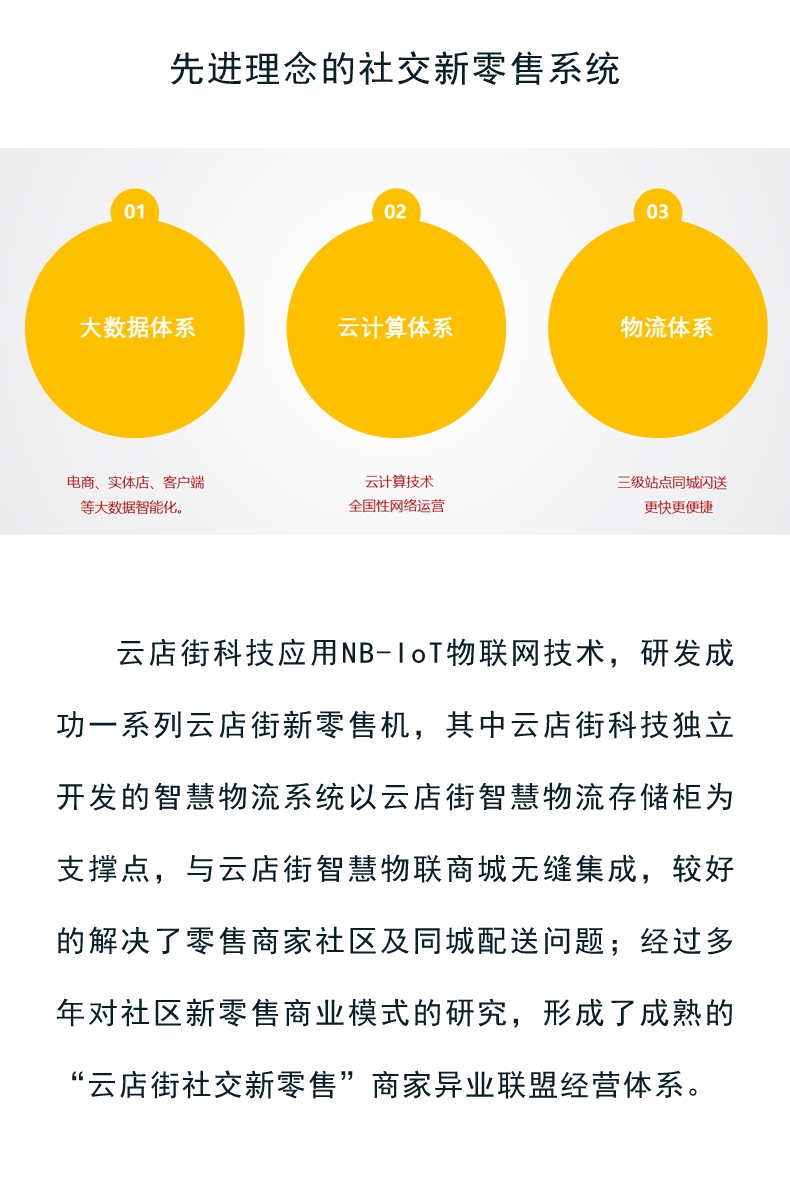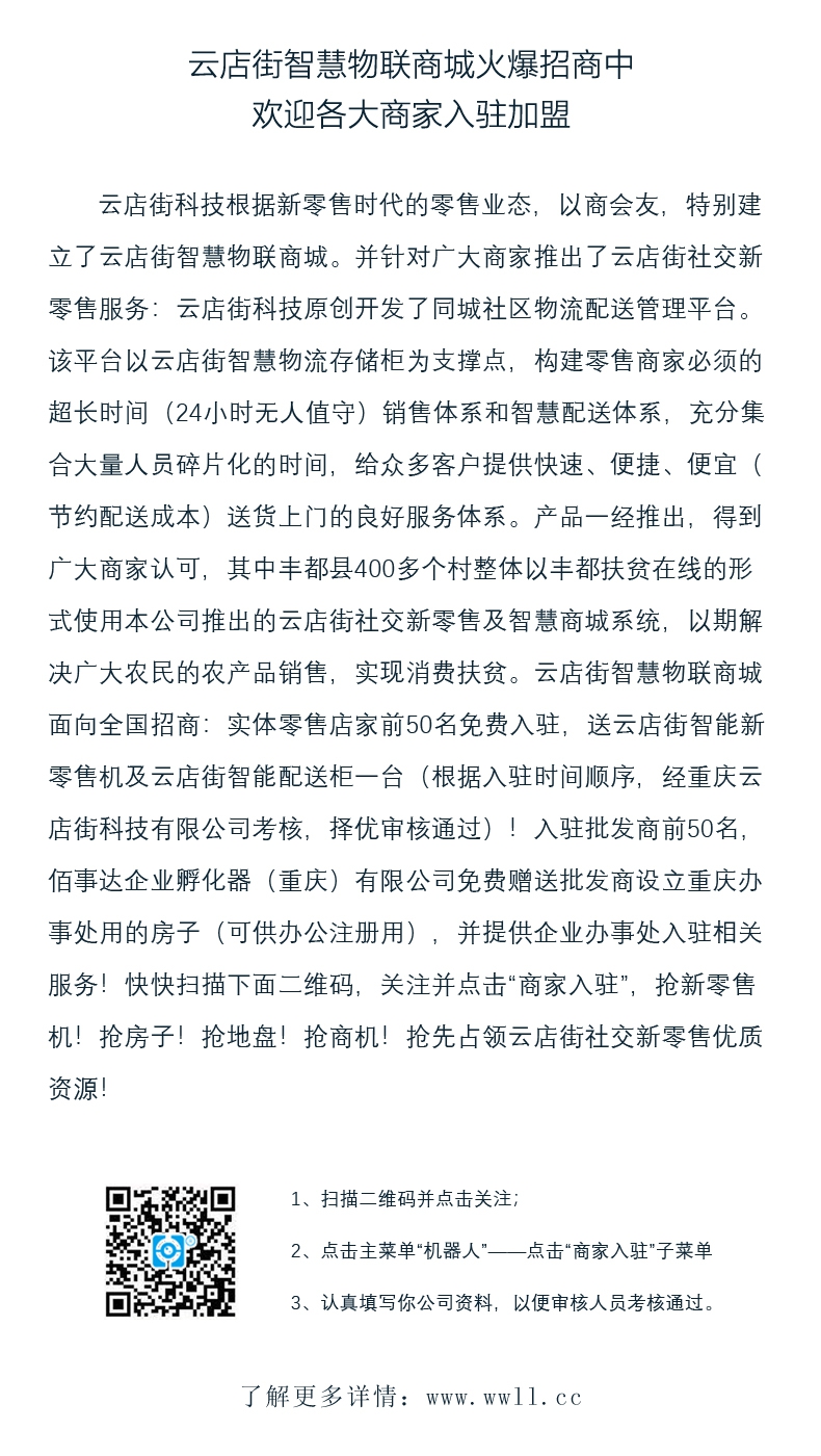 云店街科技根据新零售时代的零售业态,特别建立了云店街智慧物联商城,以商会友,针对广大商家推出云店街社交新零售服务,云店街科技原创开发的同城社区物流配送管理平台,以云店街智慧物流存储柜为支撑点,构建零售商家必须的超长时间(24小时无人值守)销售体系和智慧配送体系,充分集合大量人员碎片化的时间,构筑给众多客户提供快速、便捷、便宜(节约配送成本)送货上门的良好服务体系。产品一经推出,即得到广大商家认可,其中丰都县400多个村整体以丰都扶贫在线的形式使用本公司推出的云店街社交新零售及智慧商城系统,以期解决广大农民,特别是贫困户农产品销售,实现消费扶贫。云店街智慧物联商城面向全国招商:实体零售店家前50名免费入驻,送云店街智能新零售机及云店街智能配送柜一台(根据入驻时间顺序,经重庆云店街科技有限公司考核,择优审核通过)!批发商前50名入驻,佰事达企业孵化器(重庆)有限公司免费赠送批发商设立重庆办事处用的房子(可供办公注册用),并提供企业办事处入驻相关服务!快快扫描下面二维码,关注并点击“商家入驻”,抢新零售机!抢房子!抢地盘!抢商机!抢先占领云店街社交新零售优质资源!