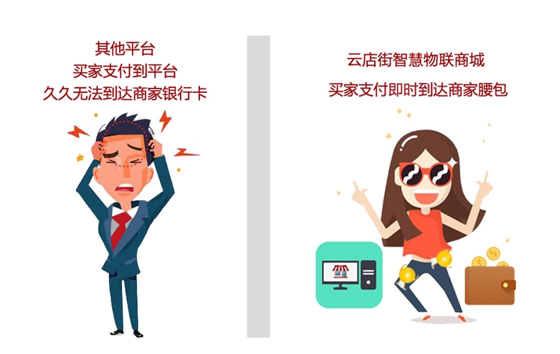 很多商家都会有这样的担忧:本来商品也没多少利润,平台还要扣除一部分,不仅如此到账也慢,买家付款后钱还在平台,长期这样商家经营资金周转困难怎么办?云店街智慧物联商城,没有第三方收款,买家付款即时到达商家账户,平台不留存。商家自己的产品自己即时收款到自己的银行账号,别的平台是平台收款然后转到商家,我们是微信官方直联,由微信就直接支付到商家银行卡。我们直营的产家直销产品,商家还可分得商品销售额的3%。
