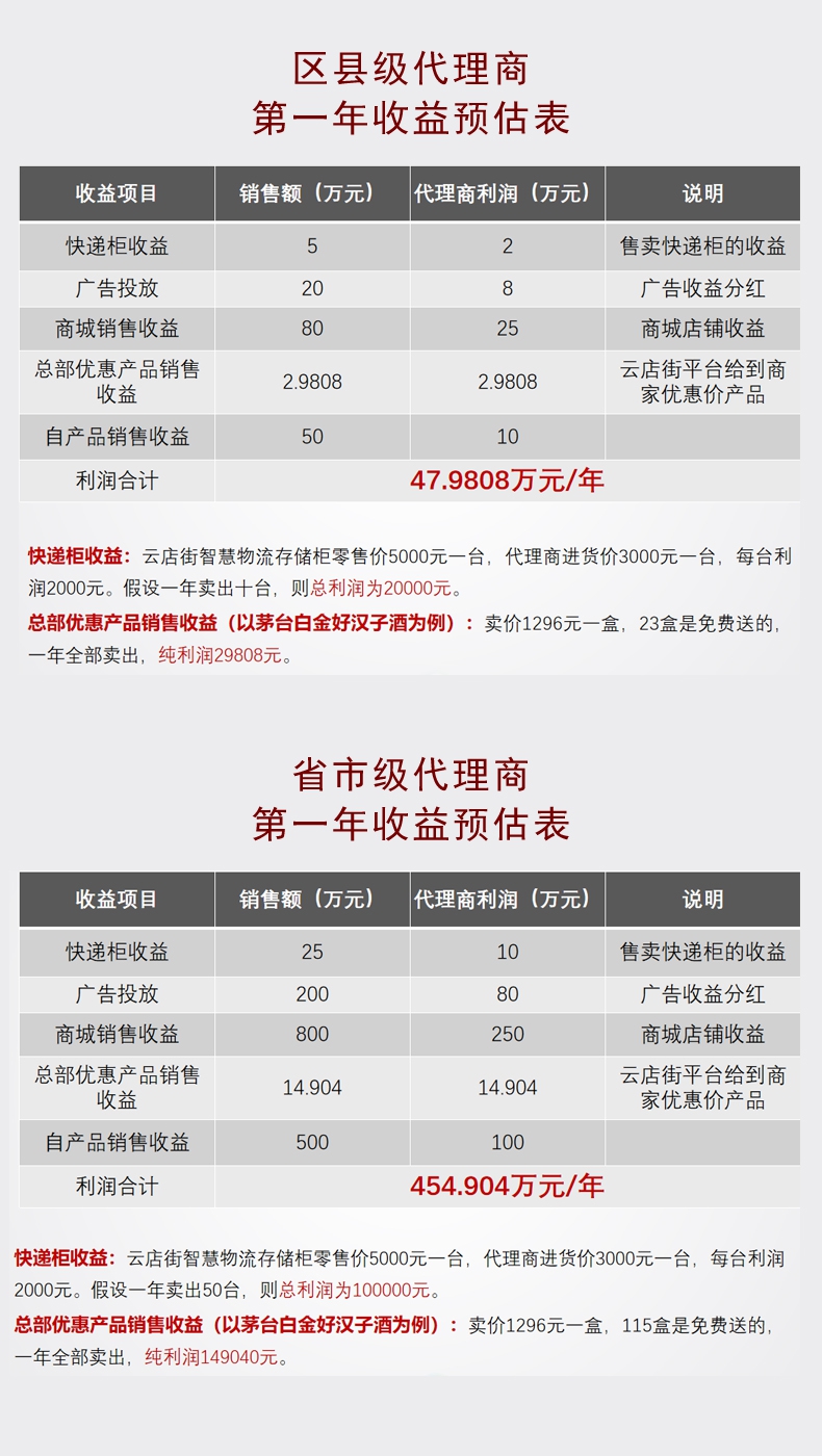 6.收益多样:产品销售利润、所在区域云店街智慧物联商城销售利润提成、所代理区域广告费提成。