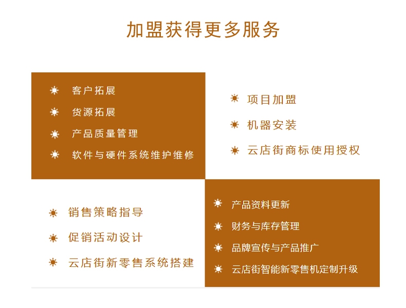 1.各类产品自动销售系统(总部全网营销强力宣传+功能强大性能稳定的云店街物联商城系统+众多客户自动手机下单,自助取货或自动通知快递员发货,所有这一系列销售营销活动,商家都不用操心!!!)