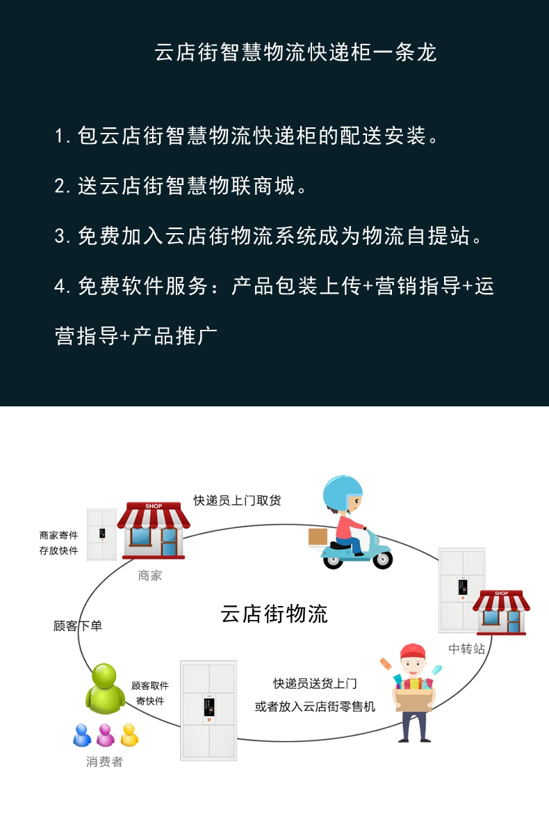 云店街智慧物流存储柜是云店街智慧物联商城物流环节的重要一环。顾客下单,商家快件放入云店街智慧物流存储柜;快递员上门取件开始配送,送到中转站将快件放入云店街智能快递柜;第二名快递员继续取件配送上门到顾客手中。