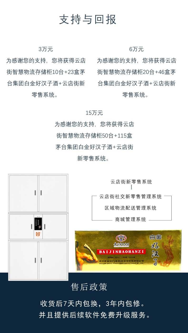 支持云店街智慧物流存储柜回报性众筹,不仅可以获得以上丰厚回礼(云店街智慧物流存储柜+茅台集团白金好汉子酒+云店街新零售系统)还可成为云店街区域独家代理!